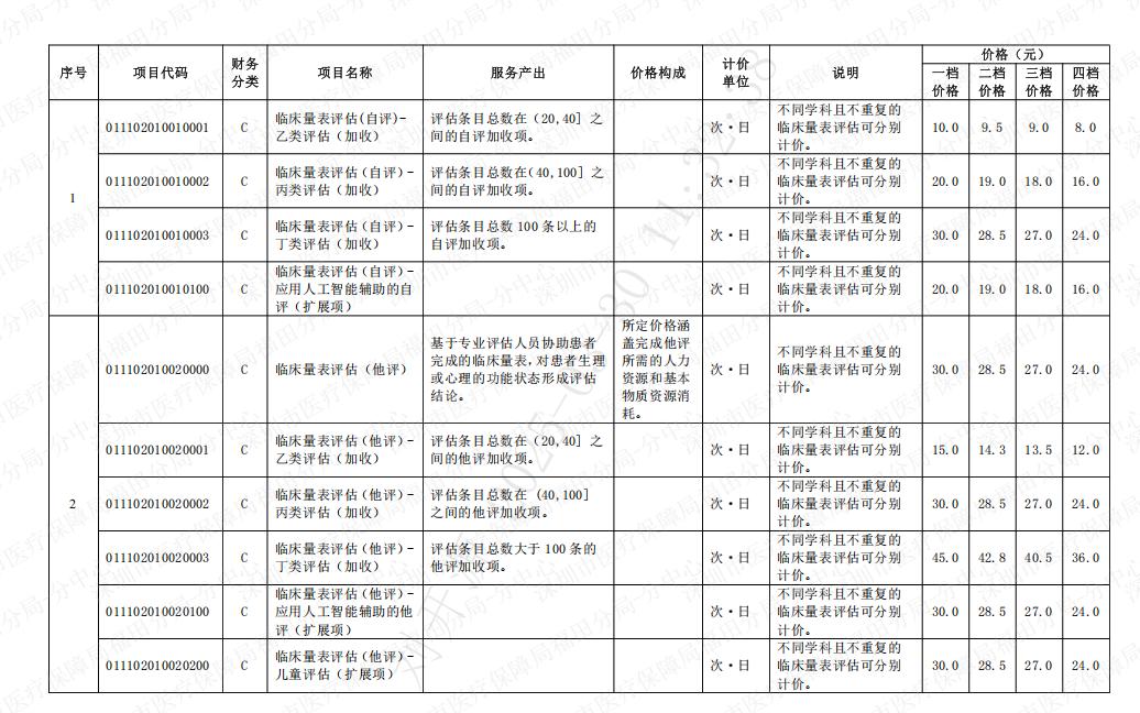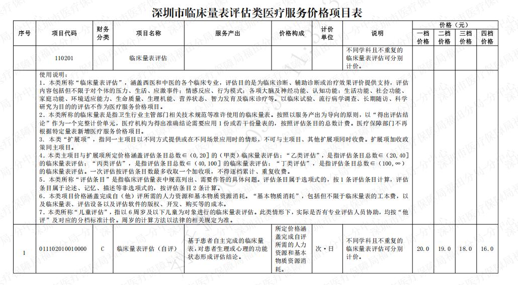 深圳市临床量表评估类医疗服务价格项目表